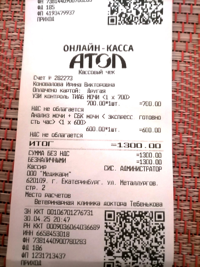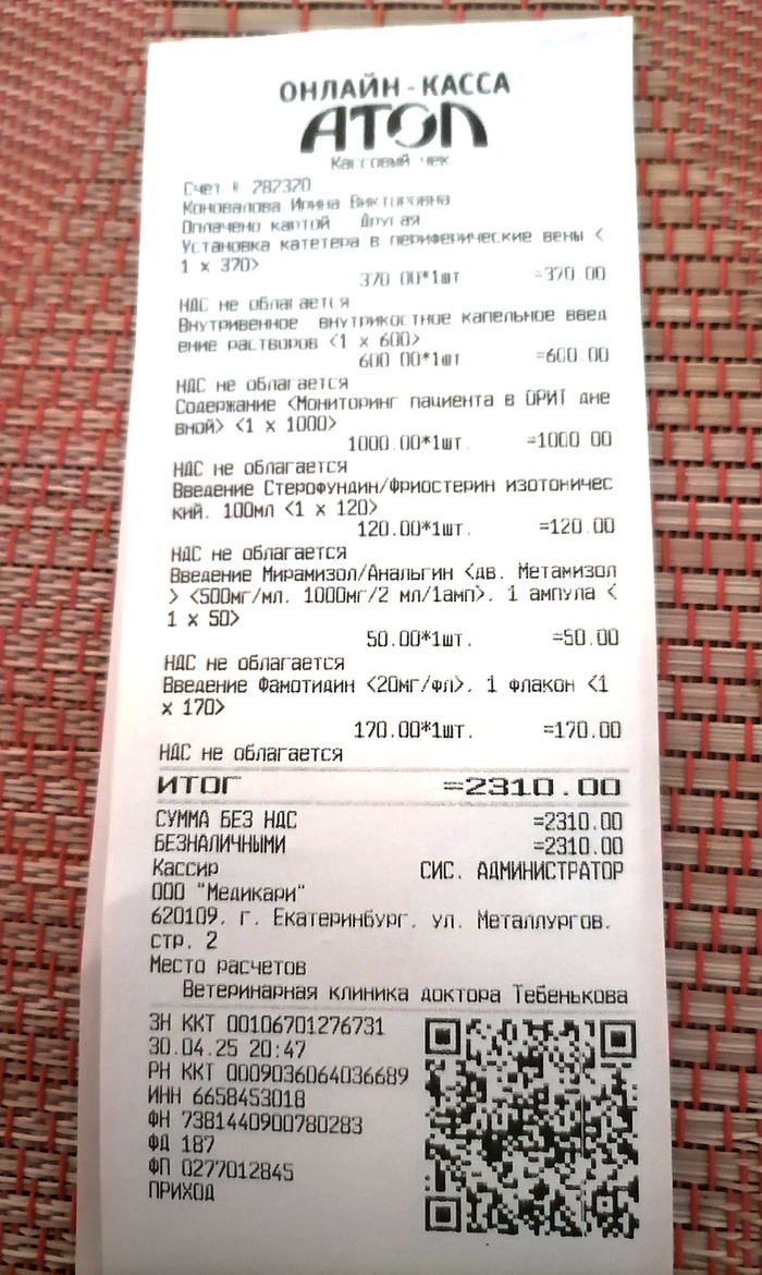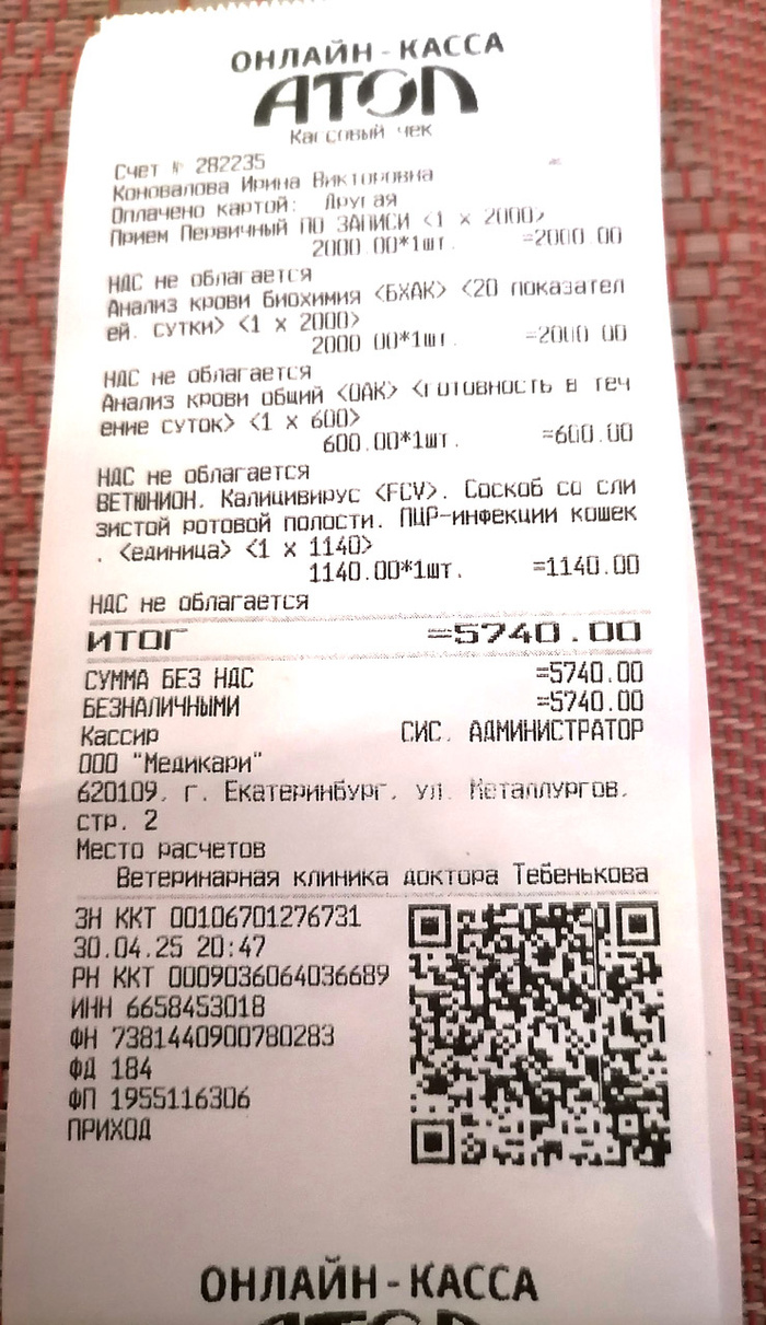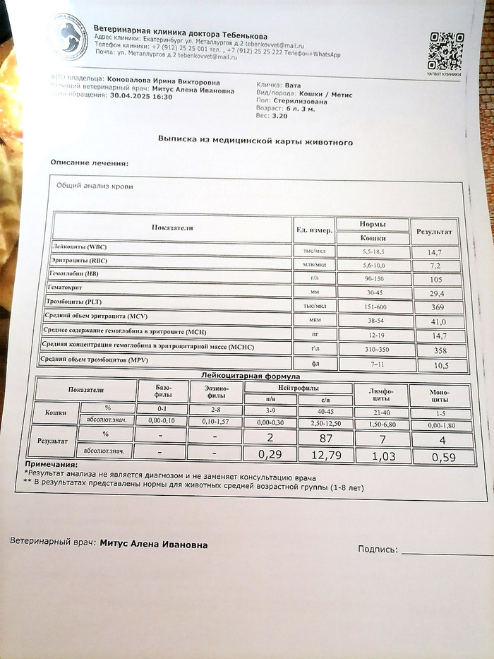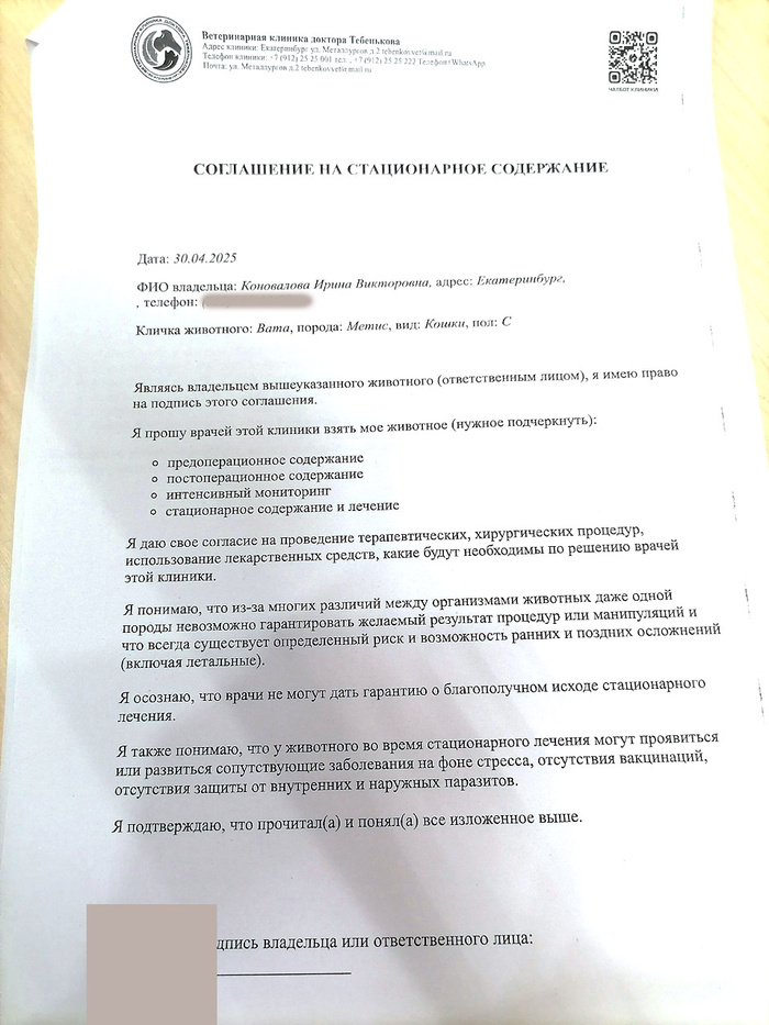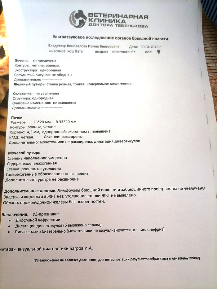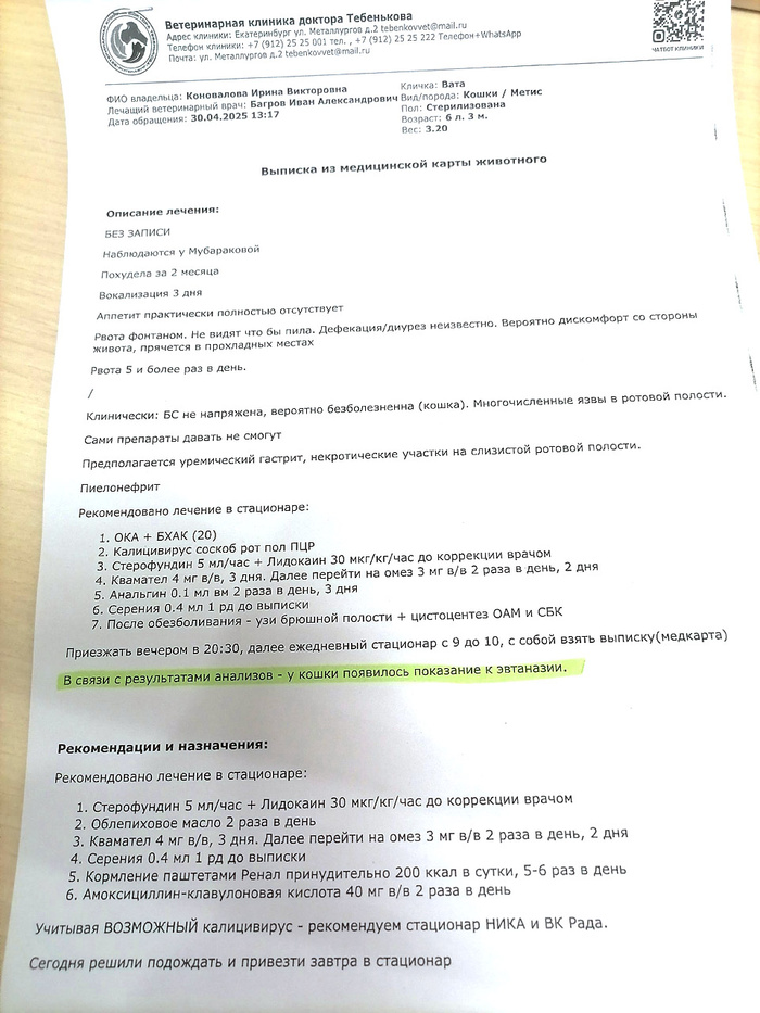 Ирина вчера прислала мне голосовое сообщение: Вату рвет, она сильно похудела, отказывается от еды, сильно плачет (этот душераздирающий крик был слышен на записи) 😭 У Ваты, напомню, ХПН 3й степени… поэтому – тут без вариантов: прием был необходим, причем срочно. Ирина поехала в клинику Тебенькова, где наблюдается Вата, в порядке живой очереди. Наш врач могла бы принять Вату не ранее 13 мая – но мы решили не ждать. И правильно сделали.