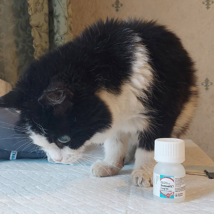 Бонечка получила персональный подарок от Светланы "_Stella_": так вышло, что у Светы образовался свободный флакон Семинтры. Аналог этого препарата, таблетки Телпрес, Боня (она на фото) получает ежедневно. Так что – благодарим изо всех сил, подарок исключительно нужный!