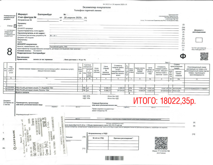 Мы закупили 30 кг котокорма! Того, что на всех котиков – ProPlan Sterilised. На сумму 18022,35р. Чек выглядит иначе – т.к. заказ составной, не пугайтесь. Куплено из расчета 2 кг на хвост на месяц и еще чуть-чуть на маленький запас.