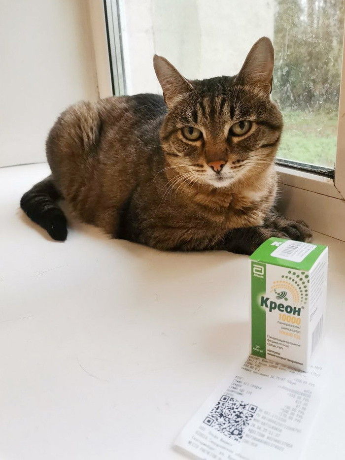 Также у Шани нашли небольшие признаки панкреатита. Велели попить Креон. Он уже куплен (330р.), котик начинает лечение.