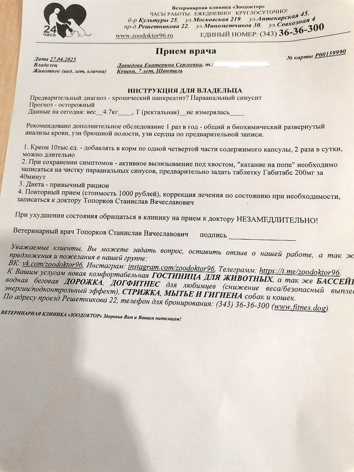 К счастью, ничего серьезного. Просто у котиньки воспалились параанальные синусы: рядовая ситуация, это не болезнь даже. Особо смелые хозяева при наличии навыков могут и сами почистить эти железы (запах при этом стоит – мама дорогая!). Скажу честно – у нас с Олей не получалось. Катя также решила не рисковать. Но Шанталик был резко против вмешательства доктора в свою личную жизнь 🤪 Поэтому договорились пару недель подождать – и, если всё будет по-прежнему, приехать на прием под успокоительным, чтобы не применять полноценный наркоз.