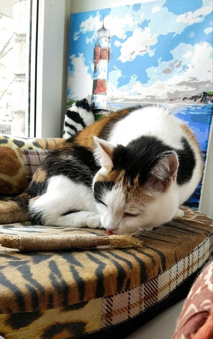 Она быстро освоилась, играть начала, облюбовала место на шкафу, перележала на всех диванах… Чувствует себя вполне расслабленно. Мы очень рады за нашу полосатую малышку