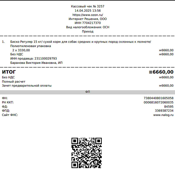 Купили ей корм – 30 кг Биско на сумму 6660р.