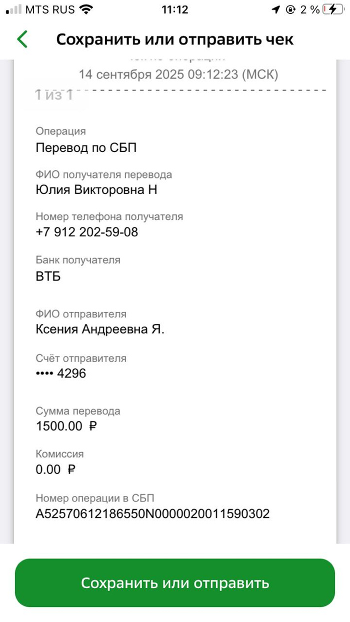 ✳по номеру телефона, привязанному к карте: 89120309059 — получатель Ксения Андреевна Я.