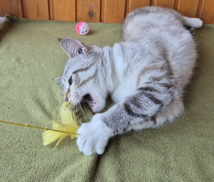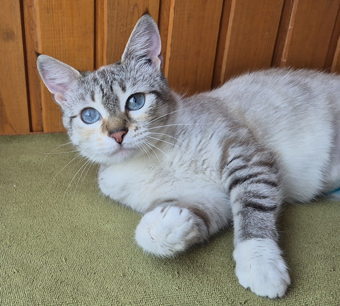 На передержке с 6 мая 2023. Был совсем тощенький, блохастый, сильно испуганный, сильно облезлый, больной. Было подозрение на лишай, но оказалось блошиным дерматитом. Были серьезные проблемы с пищеварением, через несколько месяцев ушли в ремиссию, но бывают рецидивы. Пролечили зубки, но так и не попали на прием по результатам, нужен постоянный уход, т.к гингивит и высокая вероятность развития "одонтокластического резорбтивного поражения зубов". Пробовали отправить в пиар с честным обозначением букета проблем - тишина. Продолжаем пробовать.