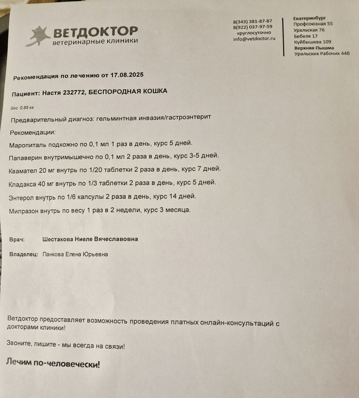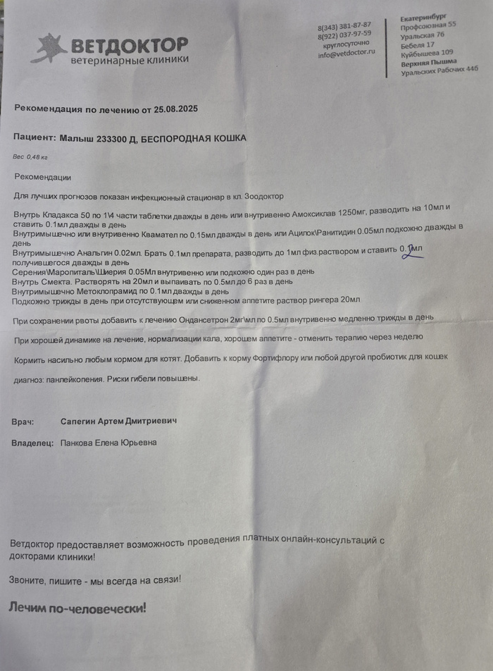 Отчитаюсь по некоторым расходам на лекарства. Получается лечим хронь в помете Авангард 1, из 2 котят, и острое состояние в помете Авангард 3, где осталось 3 котёнка.