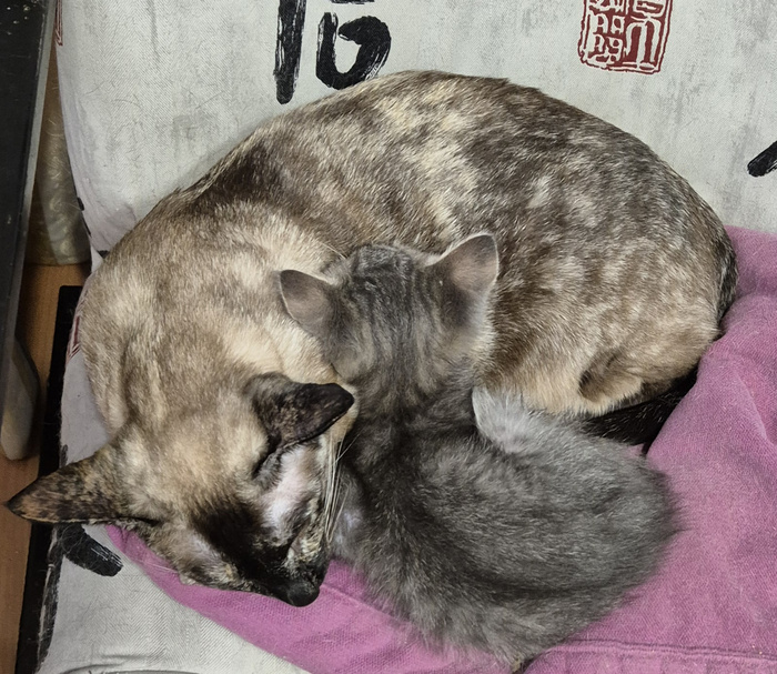 Сейчас маленького опекает наша суровая Тамара, вылизывает, греет. И он как-то успокаивается, засыпает.