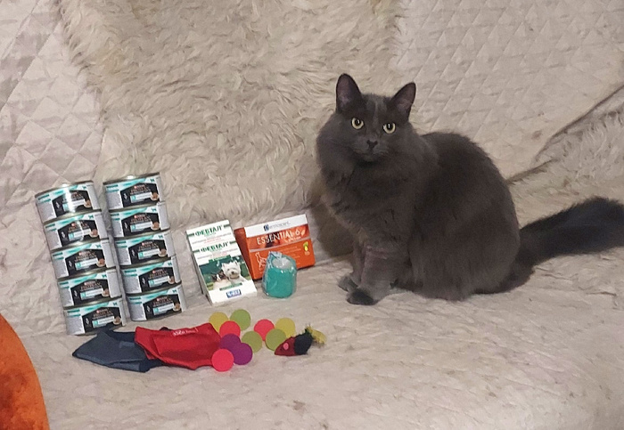 Инна "aik777" недавно передала нашим подопечным целую кучу полезностей. Блюз гордо восседает рядом – хотя это в основном не для него. Ну разве что мячики и мышки. И намордник кошачий ему пригодится (красный или черный) – если будет Хвостю кусать за попу снова Еще от Инны – 10 банок