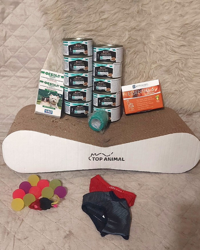 - 10 банок паштета ProPlan Gastrointestinal, глистогонка Фебтал и капли Essential, 2 намордника для кошек, игрушки -