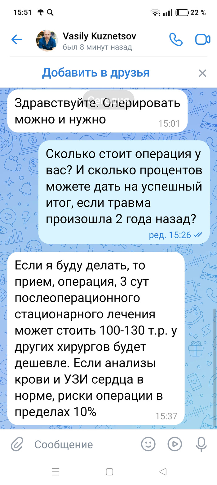 Но если есть ограничение в финансовом ресурсе и вы готовы к операции без КТ, то мы можем взять такого пациента. Просто риски будут выше. Перед операцией будет проведен контроль Р-графии, взяты анализы крови ОАК и БХАК, проведено УЗИ