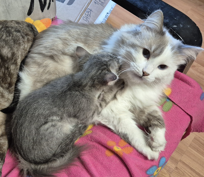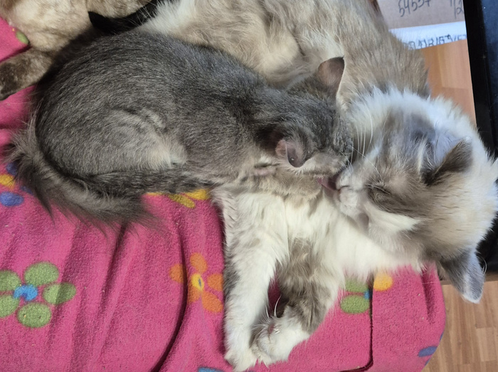 Кацман тоже ухаживает за маленьким, вылизывает.