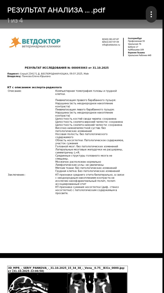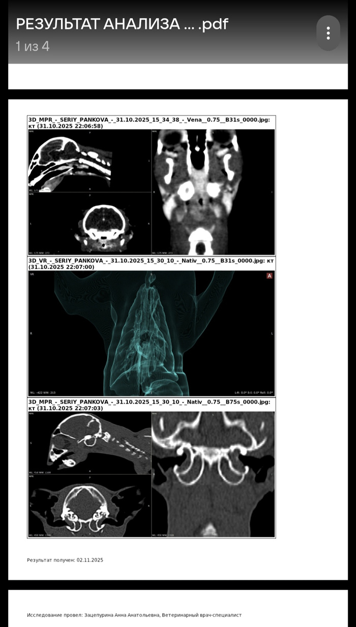 Ну вот принципе, мы почти вернулись к самочувствию, которое было до кт: кушает сам, если видит, что рядом кушает Тамара (может у него нет обоняние?), пытается играть, хрипит, периодически дышит открытым ртом, гноя из носа опять стало течь поменьше.