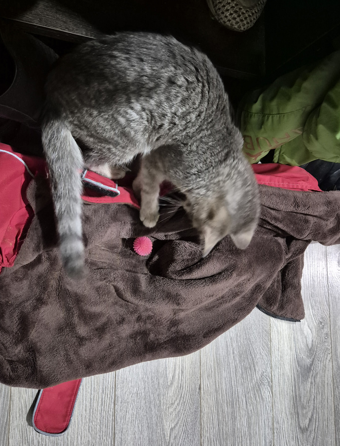 А мелкий придумал новую игру: нужно уронить собачью курточку. Закопать в неё мячик. А дальше искать-искать-искать