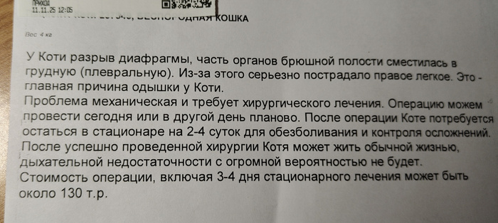 Рассказала, что кота с такой травмой оперировали в Зоодокторе и что он начал кушать и в туалет ходить и на четвертый день умер. Он сказал, это странно, какое то стечение обстоятельств. т.е. если кот операцию переживет, то шансы жить высокие получается.