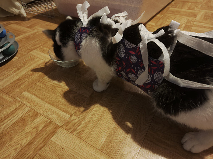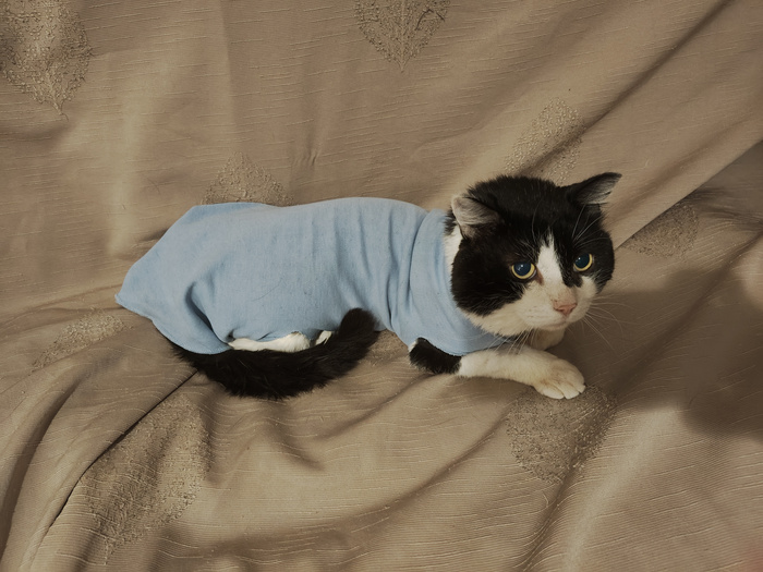 Попона жесткая какая то, я ему из рукава одежду сделала. Дома покушал, поумывался, полежал на животе и на боку, лапки вытянул, вообще так лежать не мог.