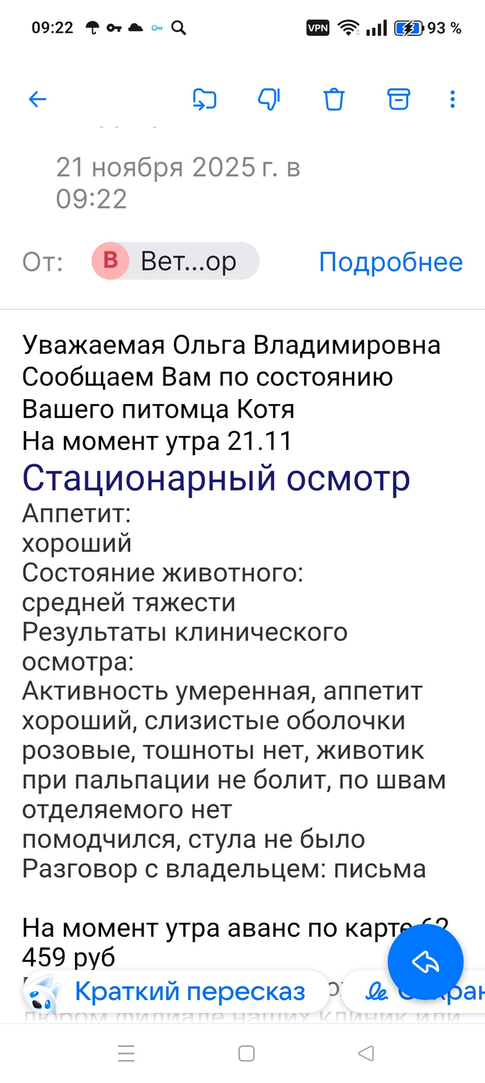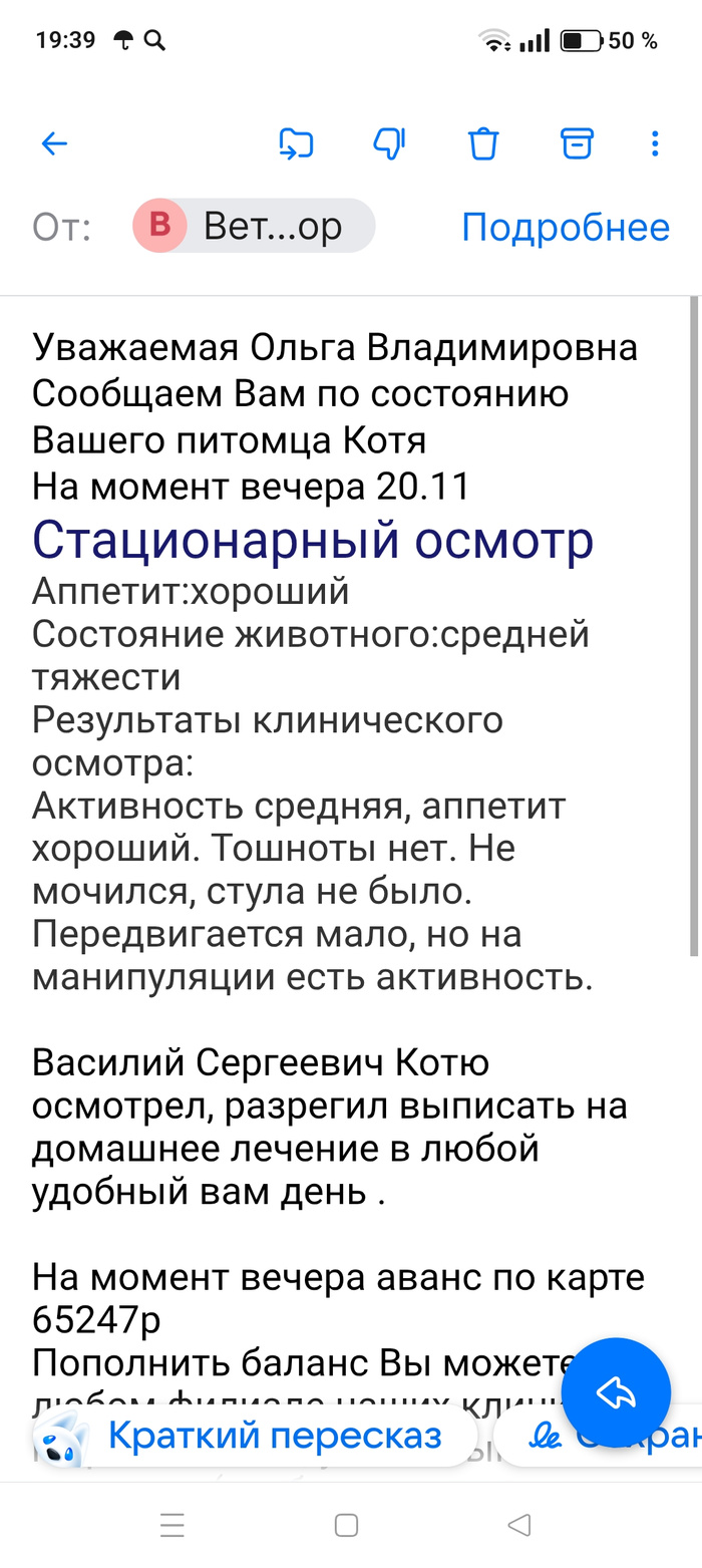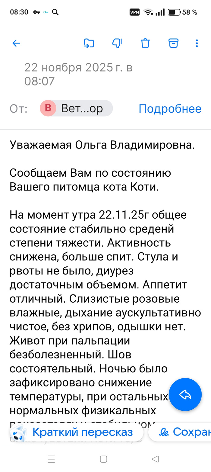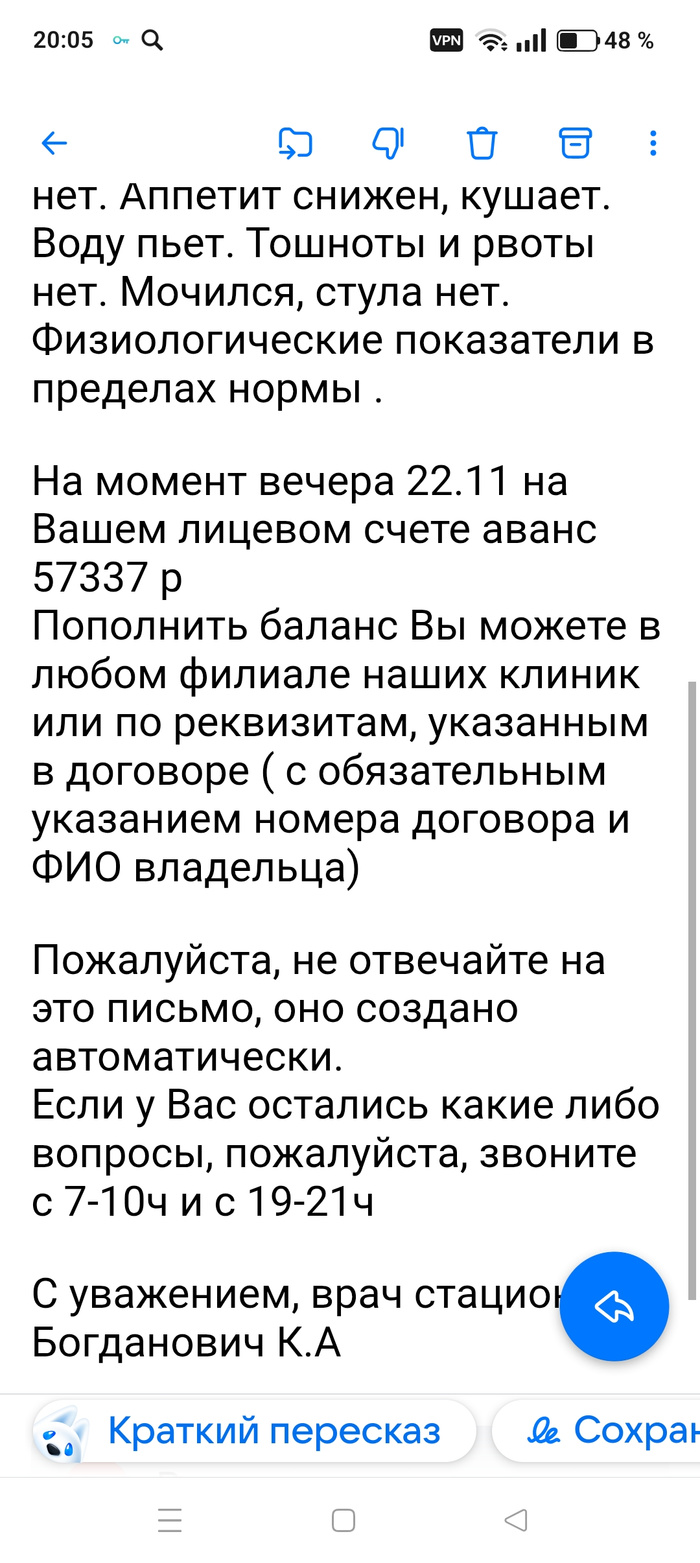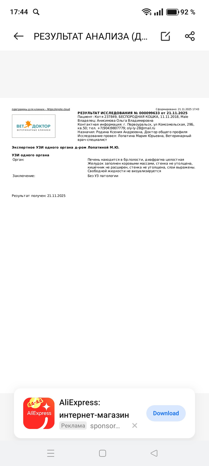 После отчета созвонилась с Ветом, она сказала, что сделали узи и у него признаки гастрита, назначили что то типа омепразола, про печень и жидкость ни слова.