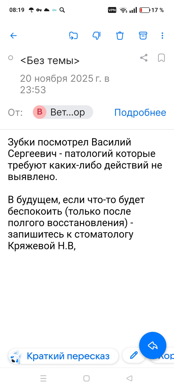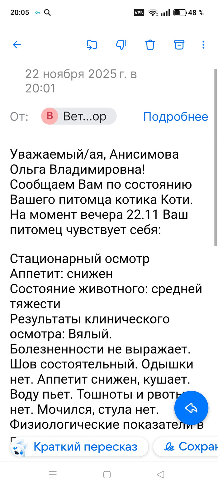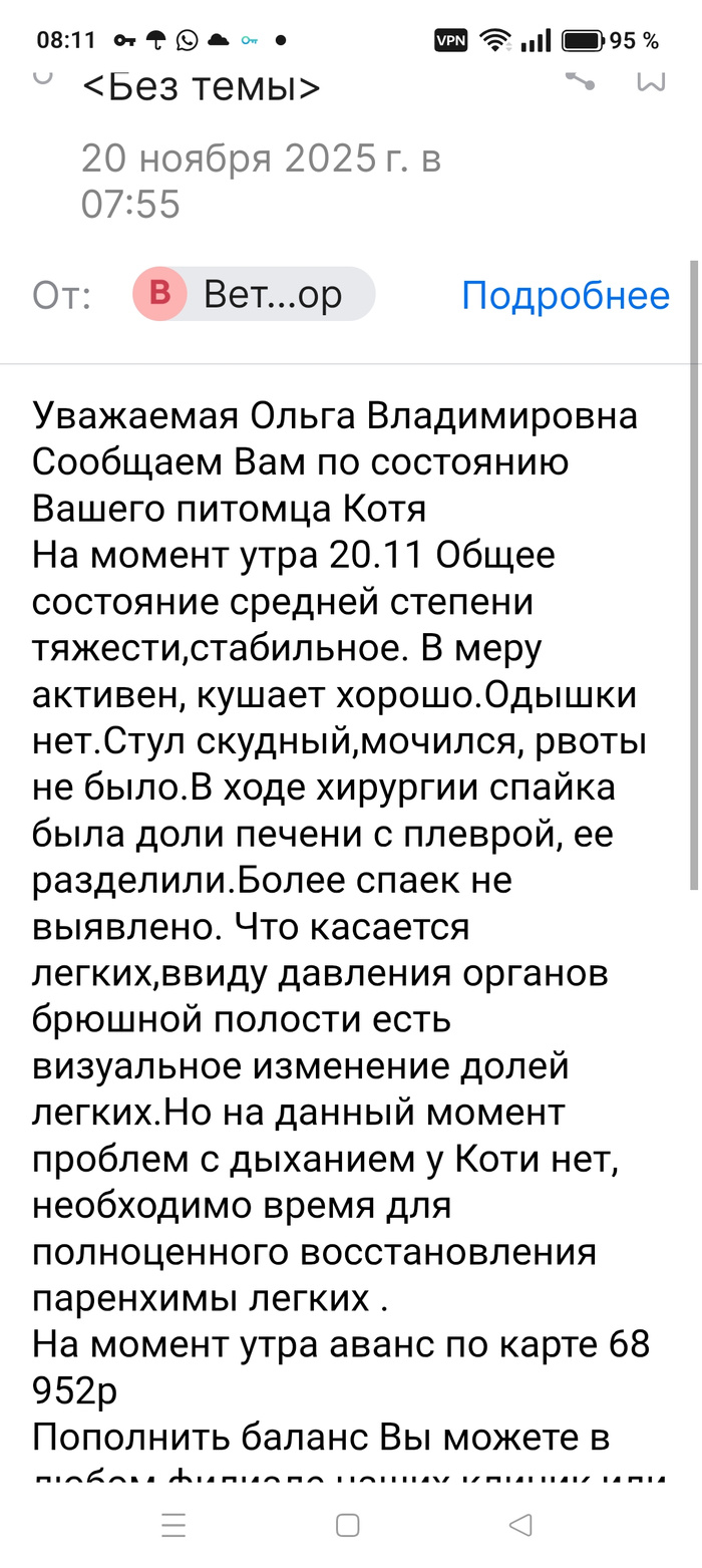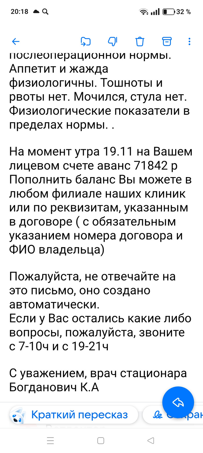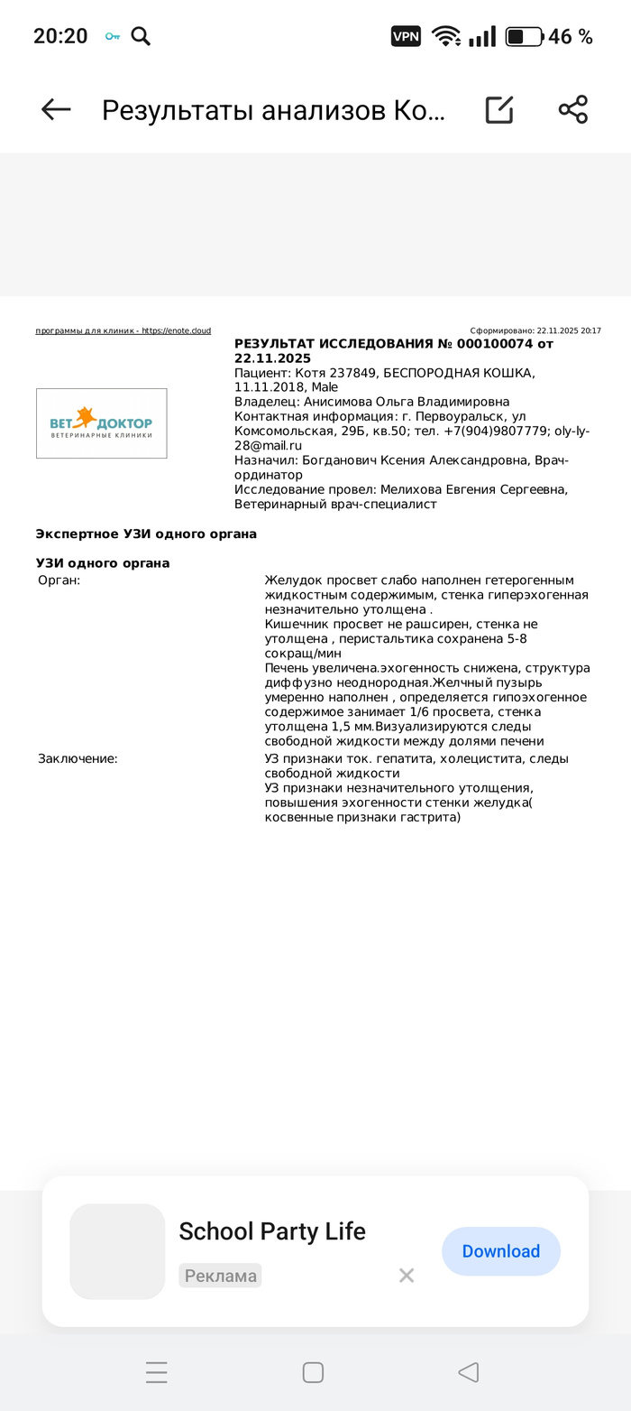 После отчета созвонилась с Ветом, она сказала, что сделали узи и у него признаки гастрита, назначили что то типа омепразола, про печень и жидкость ни слова.