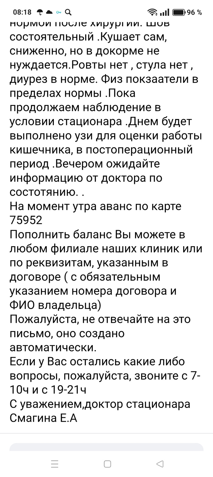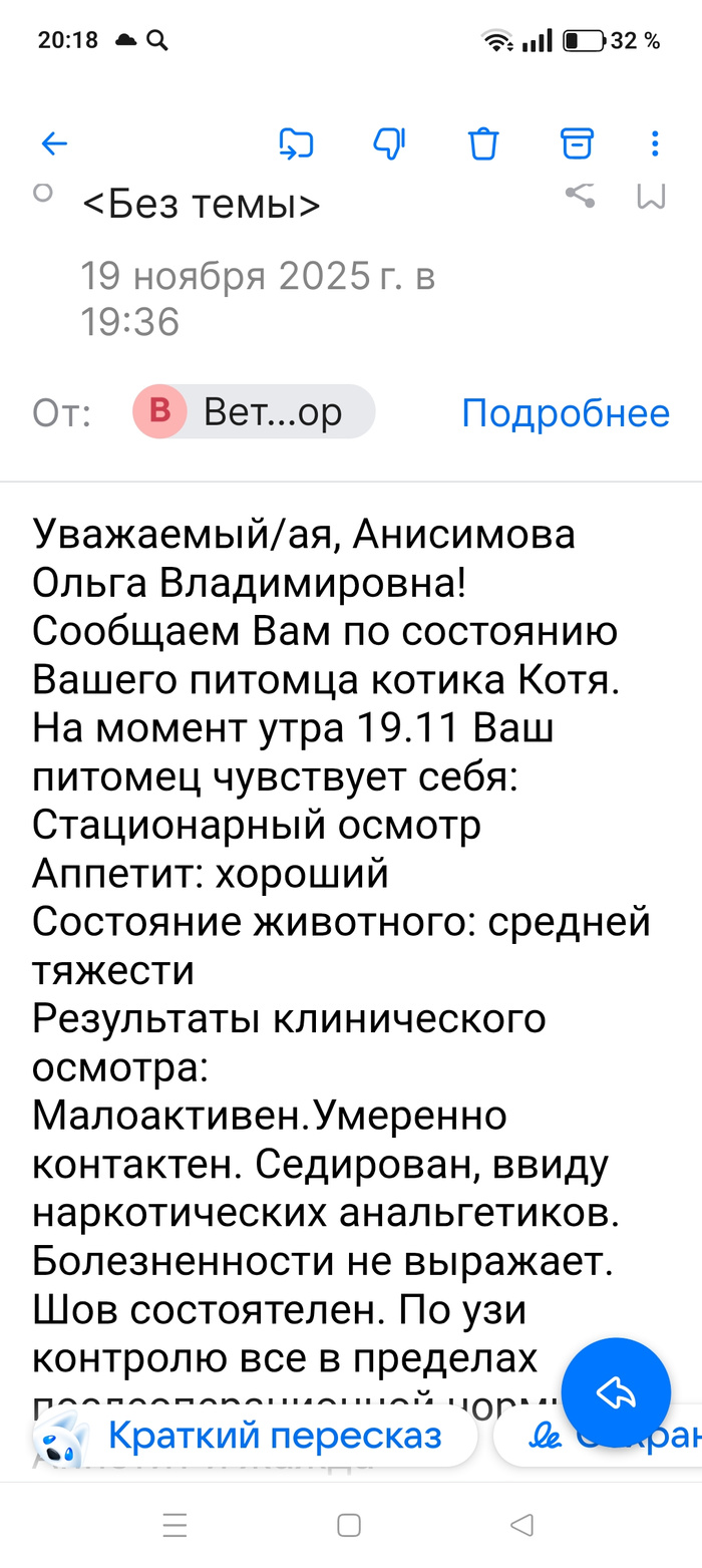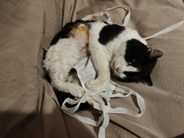 Она сказала, что кот немного пьяненький от обезболивающих, но после такой операции обширной, очень даже не плохо себя чувствует, контактный, кушает, пописил.