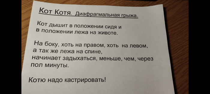 Вот такую напоминалку отдала с Котей ветеринарам, всем рассказала, в каком положении кот дышит. а в каком задыхается.
