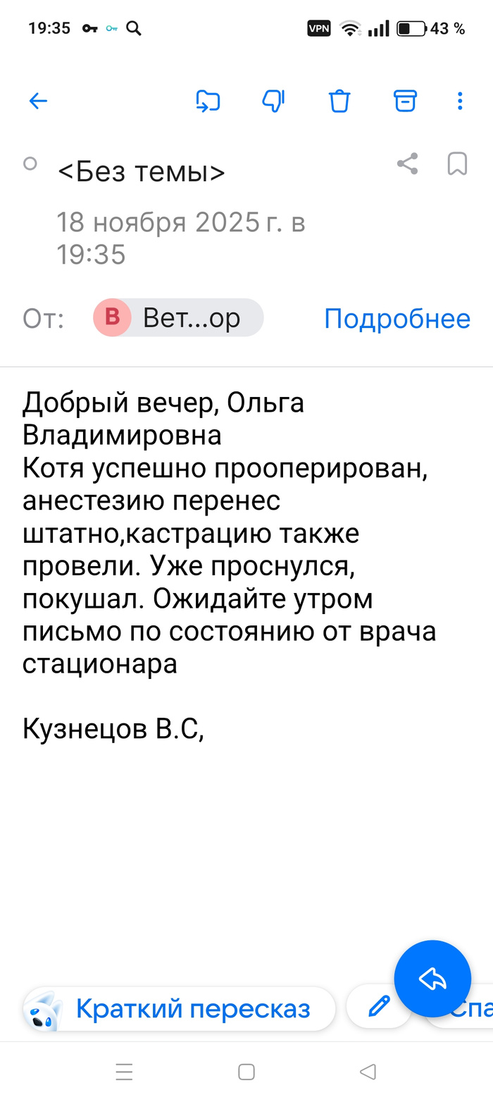 По телефону сказала, что приеду и попросила сообщить Кузнецову. Такую операцию сделал, а кот помрет потому что печень отстегнулась.