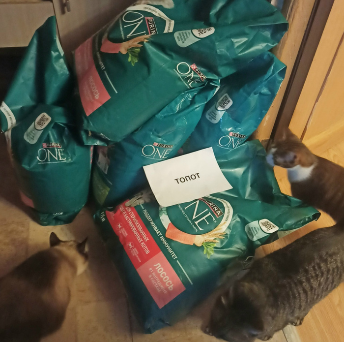Доброго всем дня! Огромнейшее спасибо всем благотворителям, друзьям за помощь в оплате корма для котеек. Мы бескураторные…. Одна не справляюсь. Понятно, никто не виноват, сама не смогла пройти мимо… В настоящее время котеек 67 , из них один совсем малышка . Кушать любят хорошо, в месяц в среднем уходит 120 кг сухого корма, влажного 650 пачек, наполнителя 200 кг. Рэйчику, песик, которому в этом году исполнилось осенью 11 лет, покупаю сухой корм, баночки и дополнительно готовлю. В среднем это более восьмидесяти тысяч рублей. Всегда очень благодарна людям за помощь!!! Корм накупили заранее на месяц вперед, хоть и в долг, но зато будут ребятишки сытенькие, чтобы не рисковать, тем более в период нестабильности и ценовой и финансовой... Конечно же, дополнительно и пеленки и витаминки, медикаменты и обработка . Средств просто не хватает, поэтому с протянутой рукой о помощи….. Повезло купить по хорошей цене с рук Пурина Ван сухой 50 кг, срок заканчивается у него в декабре. Но мы в ноябре его съедим.