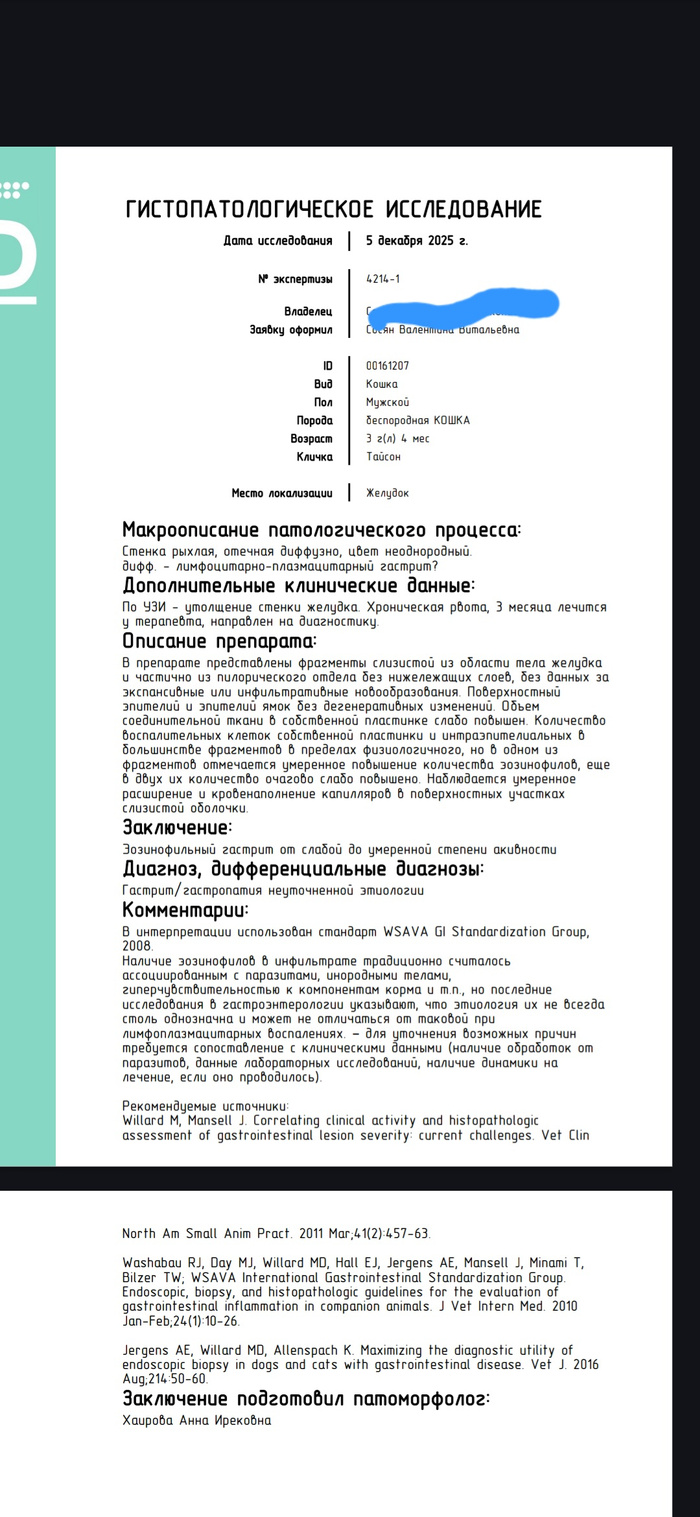 Спасибо большое всем за руководство, что же нам делать дальше. А от чего этот гастрит мог произойти? У котика не было смены корма, ничего не менялось. Он ел Грендорф фреш для стерилизованных.