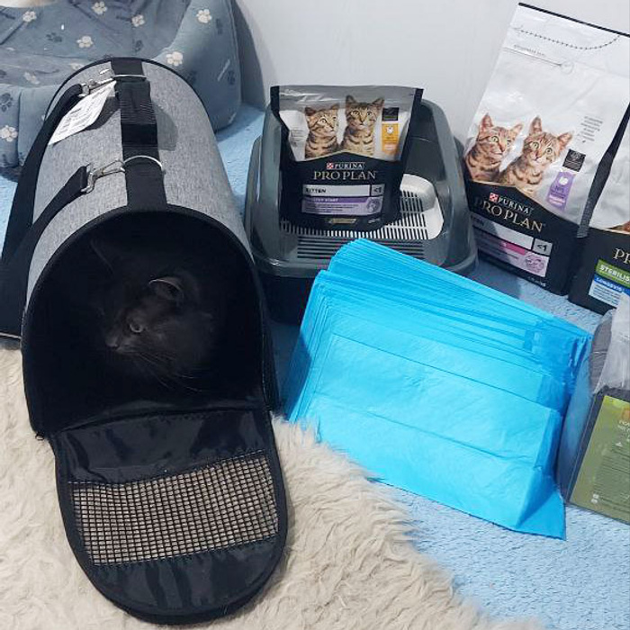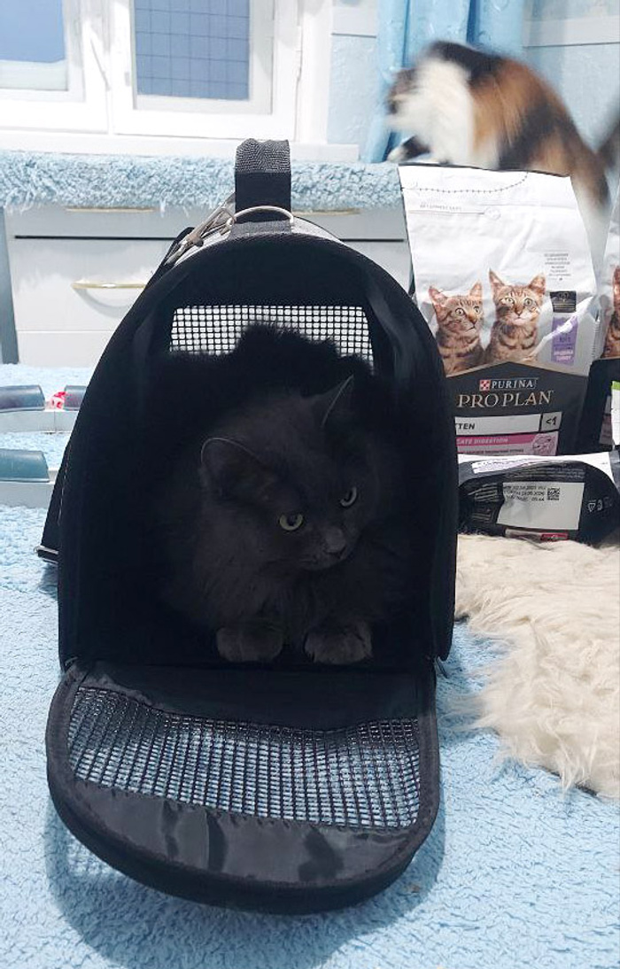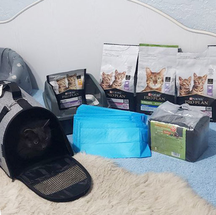 Вчера наша Оля "NiksS66" принимала подарки от Ирины "Solnishkoo". Ирине огромное спасибо! В подарке – сухие корма Проплан для котят (это Маняше, конечно) и для стерилизованных котиков 7+ (такие тоже имеются у нас на попечении). Еще в подарке много пелёнок, лоточек и… переноска. Блюз сразу облюбовал
