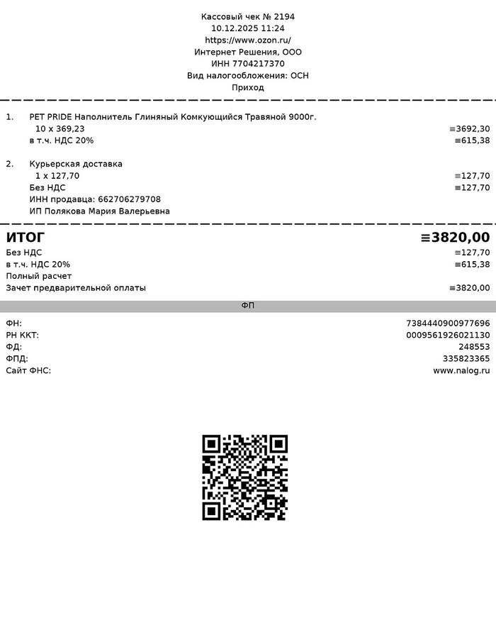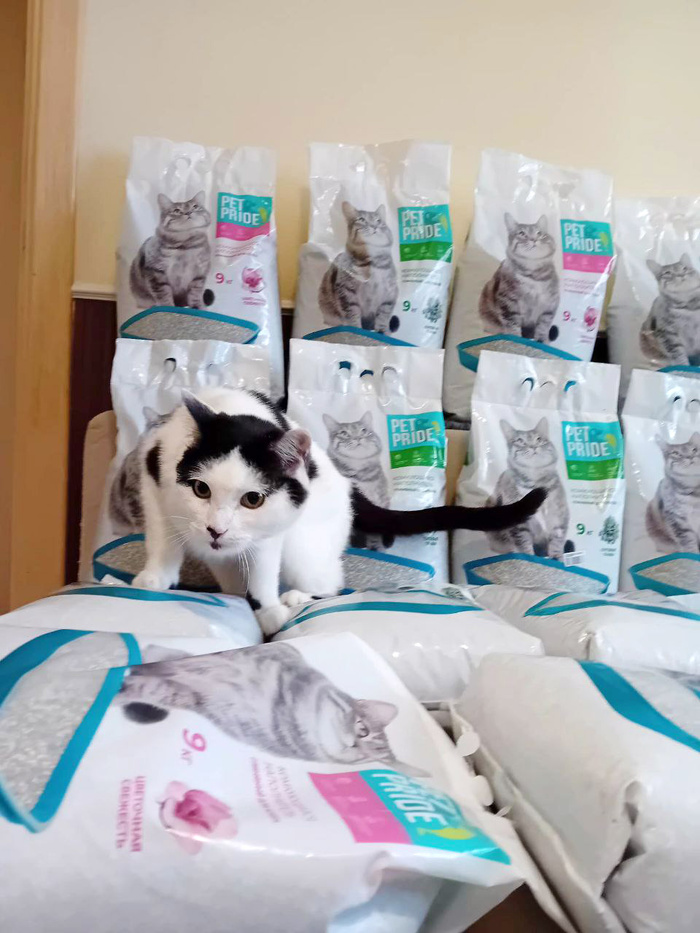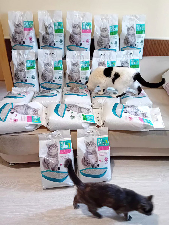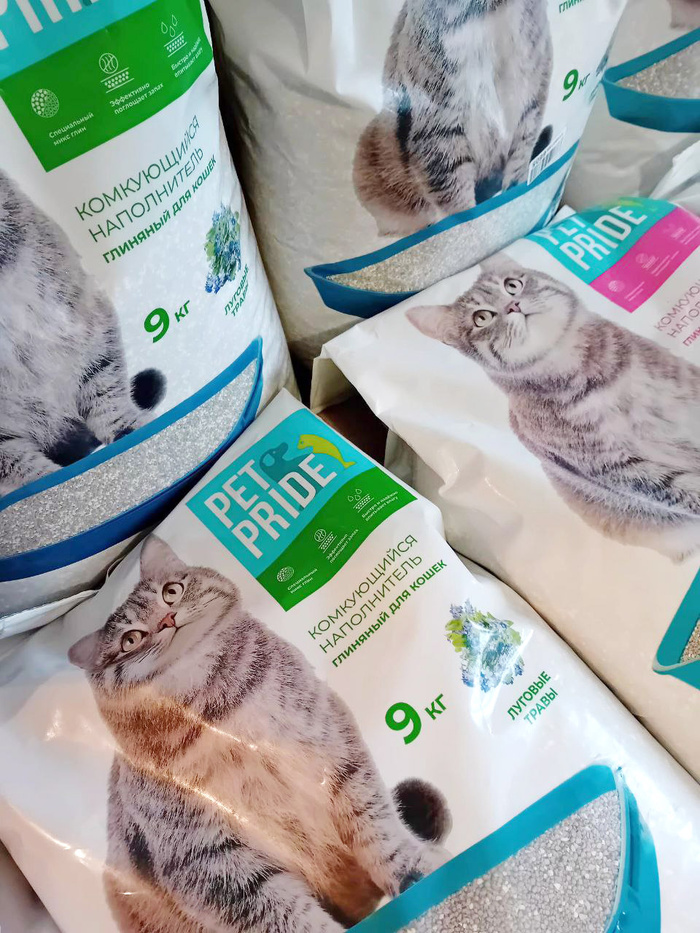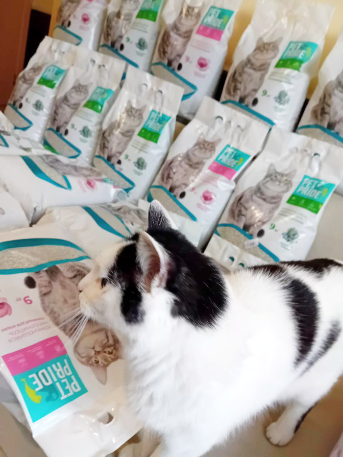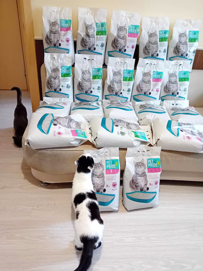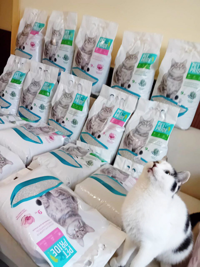 Затарились мы, чудом изловив на Озоне шикарные ценники на PetPride. Я заказала сначала 10 пакетов травяного на сумму 3820р. Потом побоялась, что вдруг не привезут столько (т.к. маячила надпись про ограниченное кол-во товара) – и заказала еще 10 пакетов цветочного (4240р.). В итоге приехали оба вида в полном объеме.