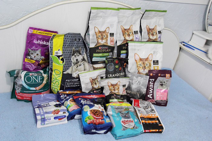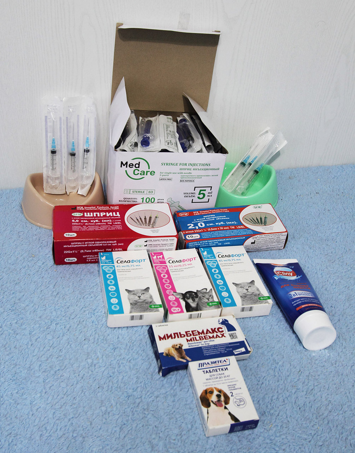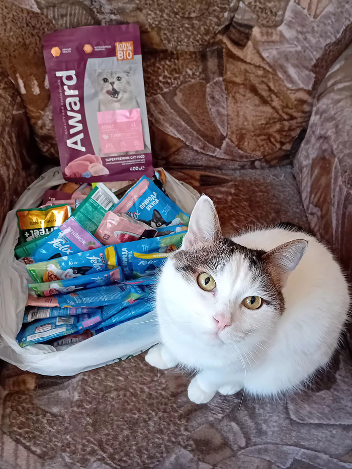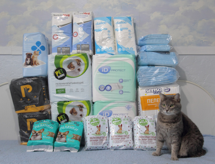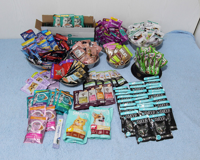 Посмотрите, сколько всего отправили дети нашим подопечным котикам! Сухие и влажные корма, наполнитель, медикаменты, средства обработки… И целую гору пеленок. Кисонька Хвостик оценила! Пестрая Акация, котики Блюз и Барсик – все радовались подаркам!