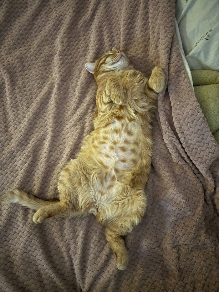 «У нас с Сырником все хорошо, кушает отлично, пьет тоже, в туалет ходит раз в день, наладился стул. Адаптировался уже полностью, устраивает нам тыгыдыки по вечерам и приходит выпрашивать свой пакетик всегда стабильно в 6 утра, все по часам. Пузико у него побритое, брали у него кровь в декабре на общий анализ крови и на биохимию, а также делали УЗИ брюшной полости просто для профилактики, по анализам все хорошо» 🫶