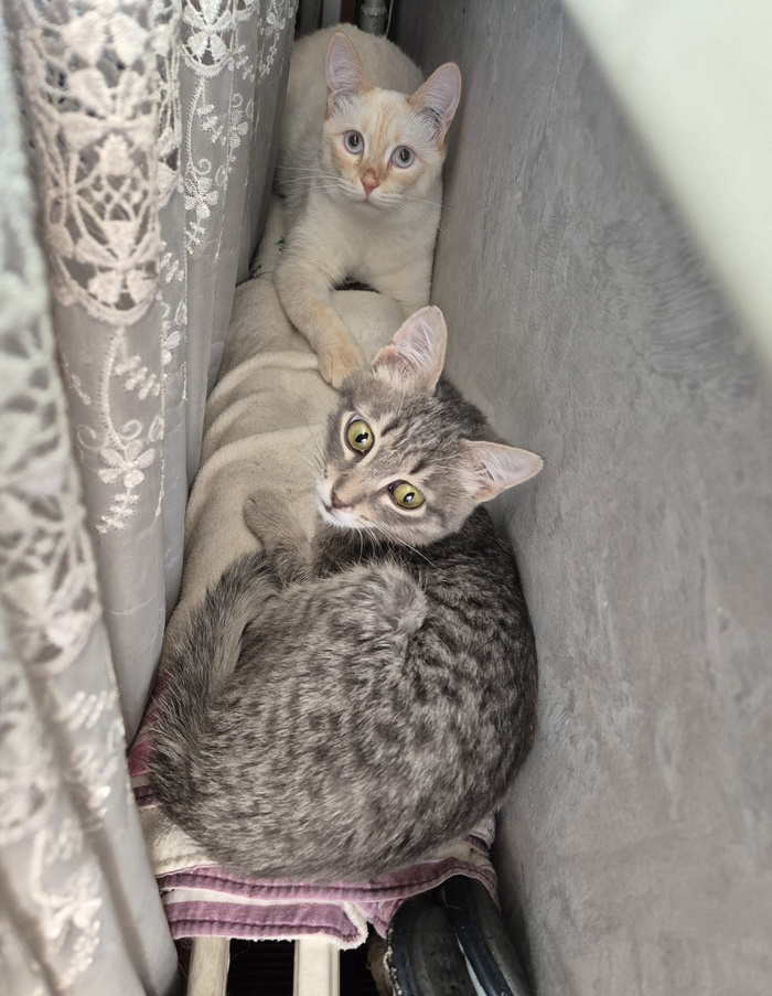 Кошки мама и дочка. Возможно их историю кто-то видел в ВК (с ними еще был котик-сынок белый с серыми пятнами). В снегопадный день их принесли в рюкзаке дети в церковь на Уралмаше. Это та самая церковь, откуда у нас побывали "церковная киса" с кучей котят. Детей отправила мама, т.к у "ребенка аллергия". Усилиями девочек, работающих в церкви, котик-сынок был куда-то пристроен. Девочки-кисы остались.