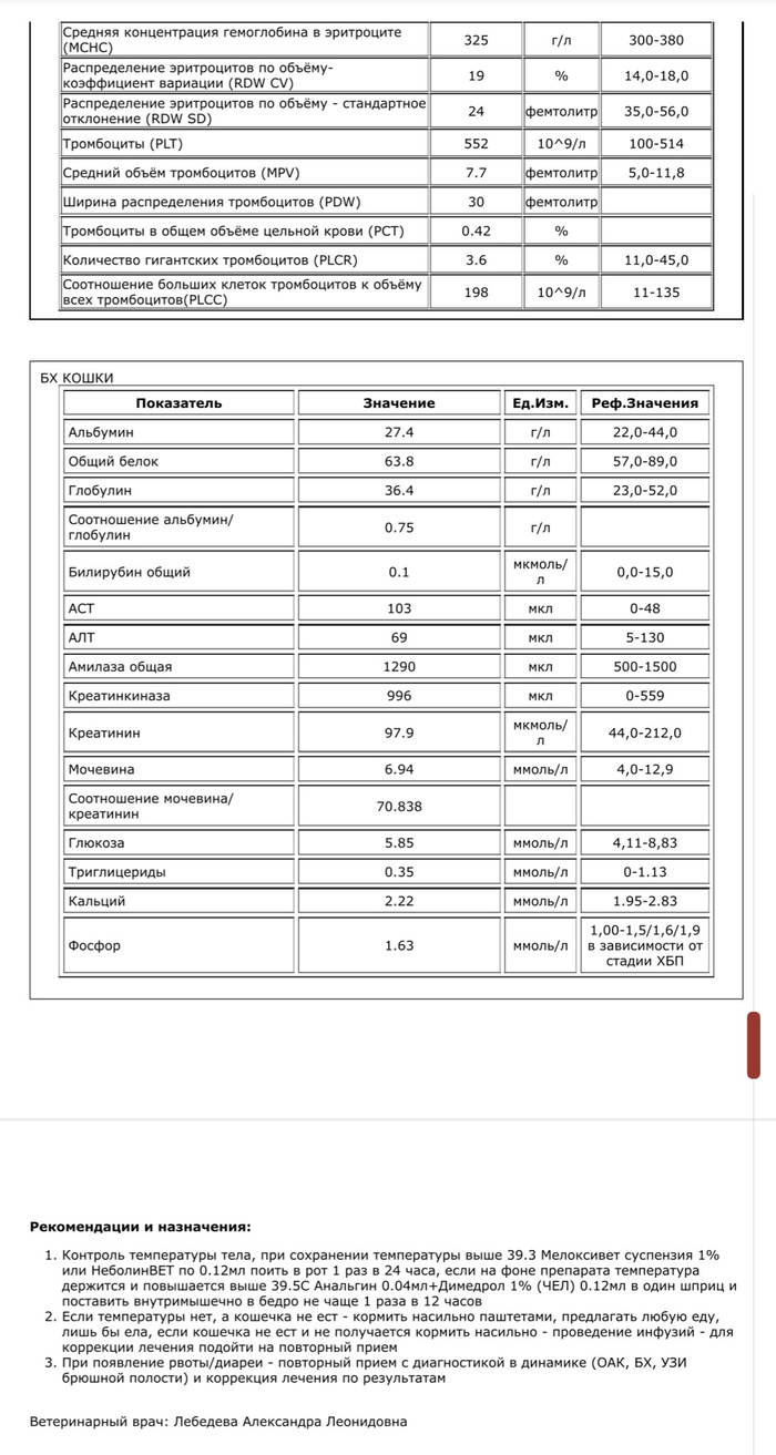 Взяла её на приём в среду, совместно с рыжей кисой. Анализы оказались почти нормальными, кроме чуть пониженных лейкоцитов и повышенной креатинкиназы. Температура 39.5