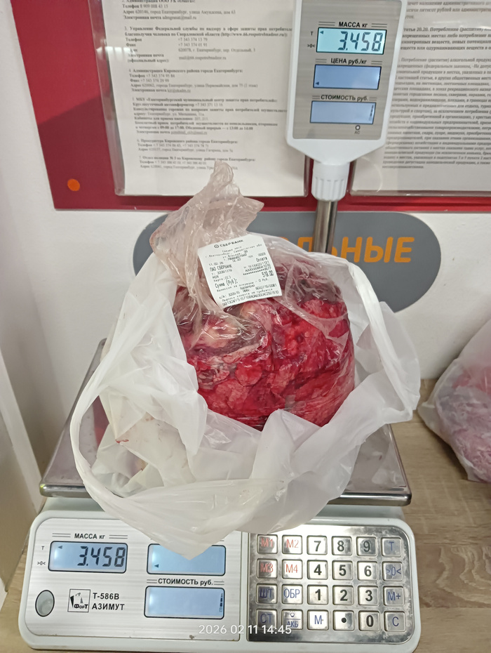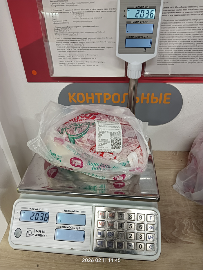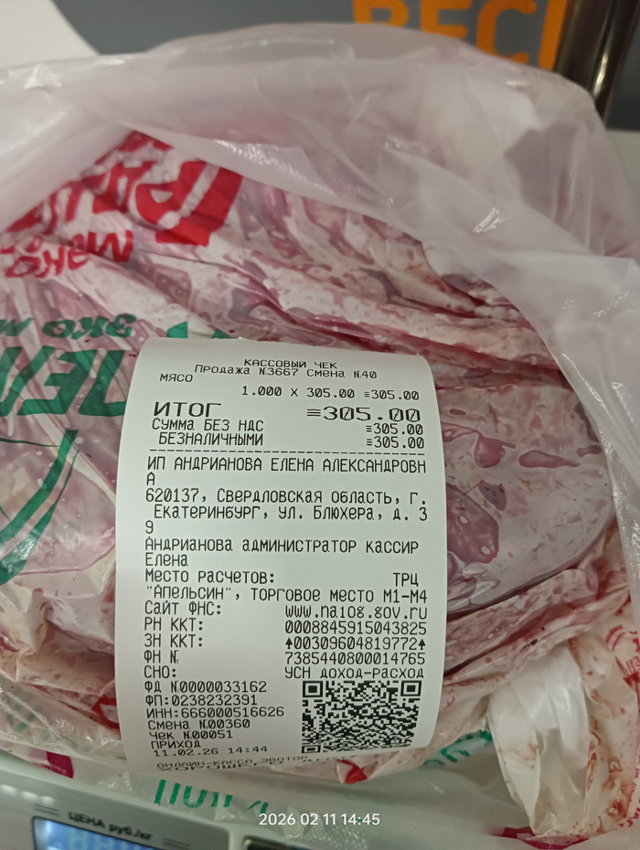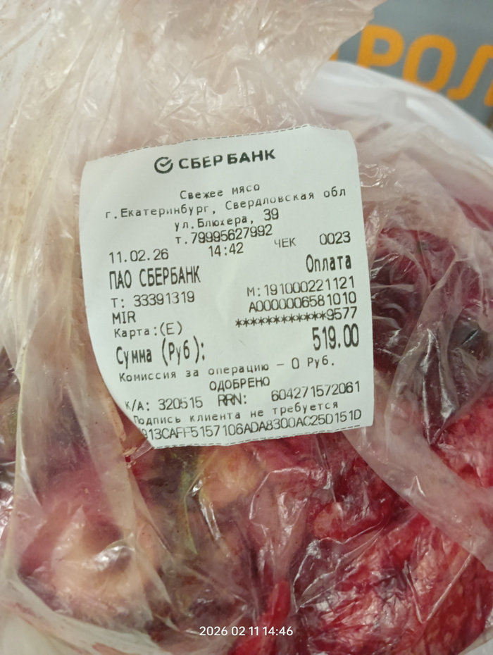 Чек на покупку куриных спинок по 65 рублей за кг.