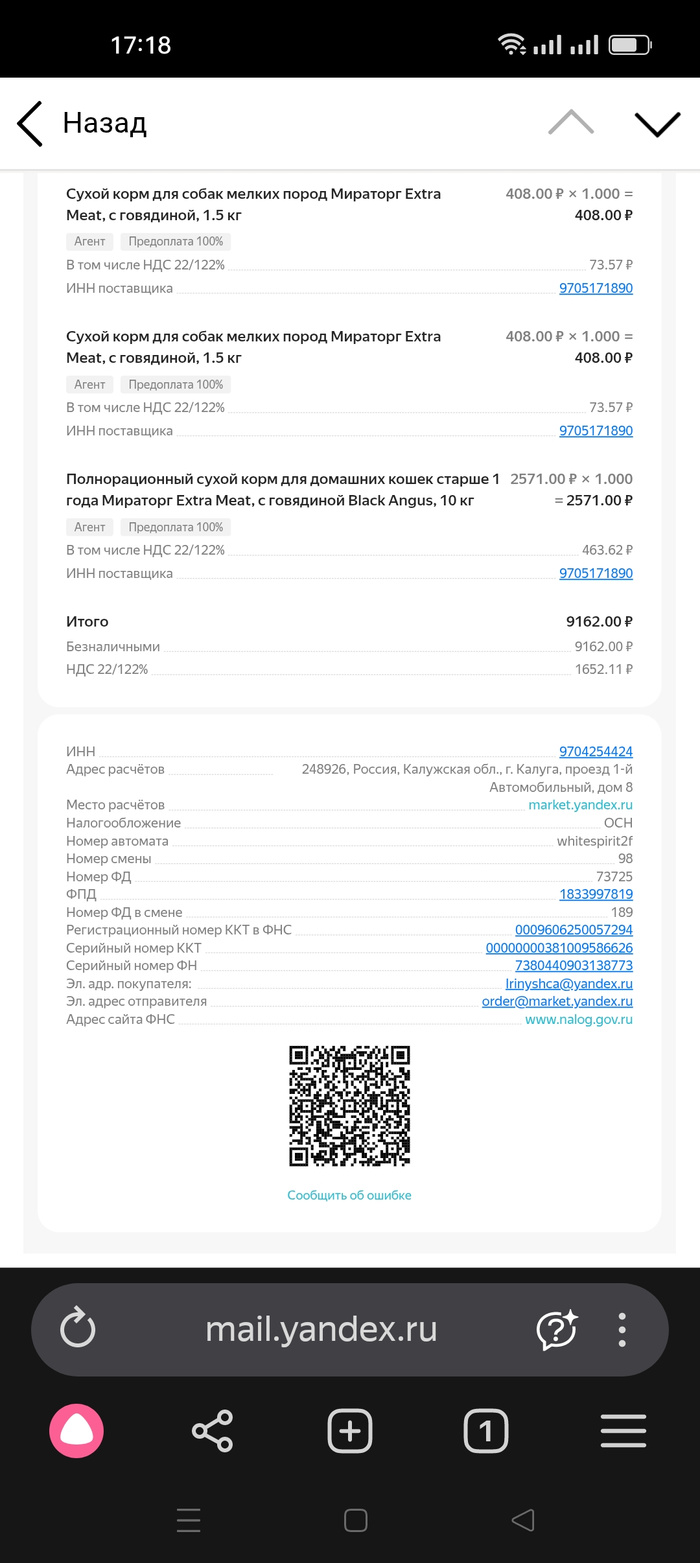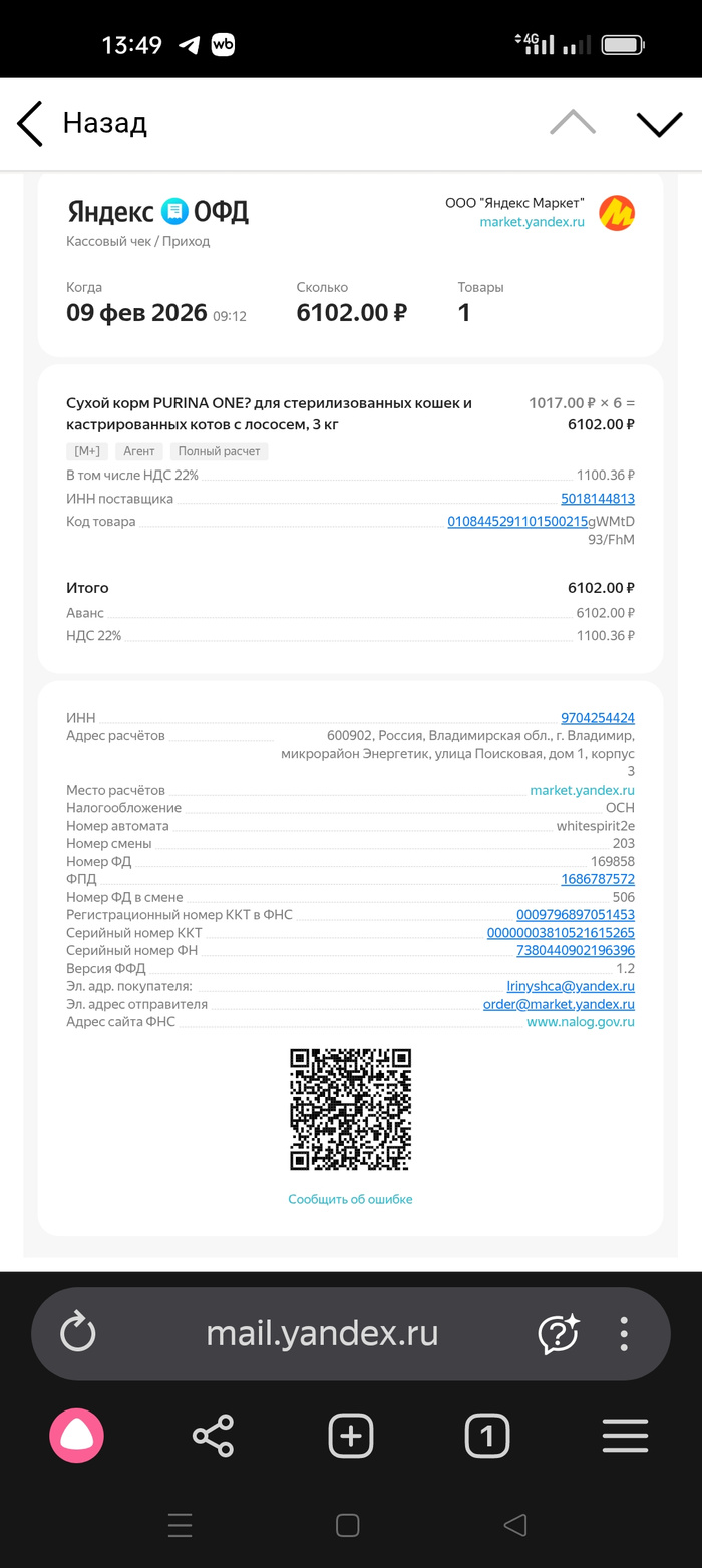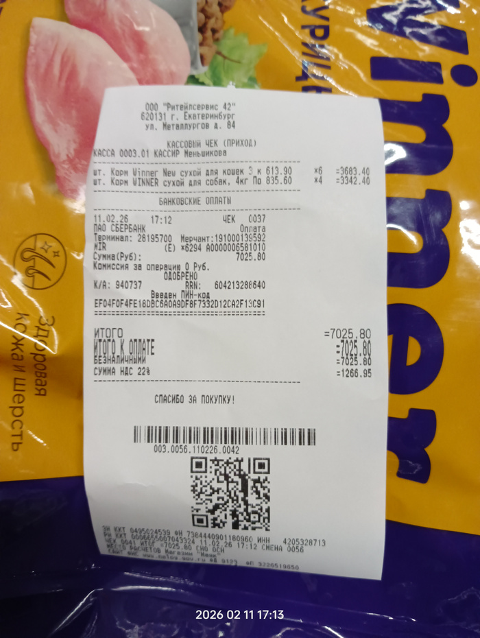 Чек на покупку корма для кошек