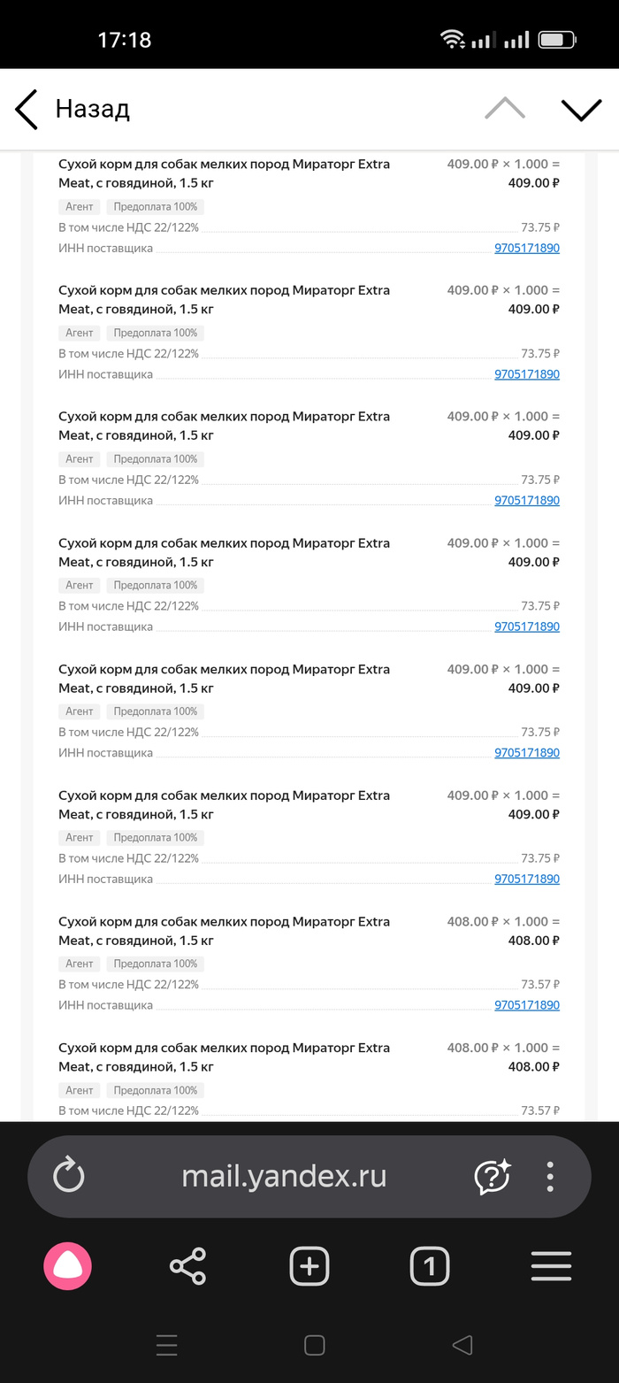 7). Влажный корм Чаппи по 20 рублей 60 штук = 1 200 рублей