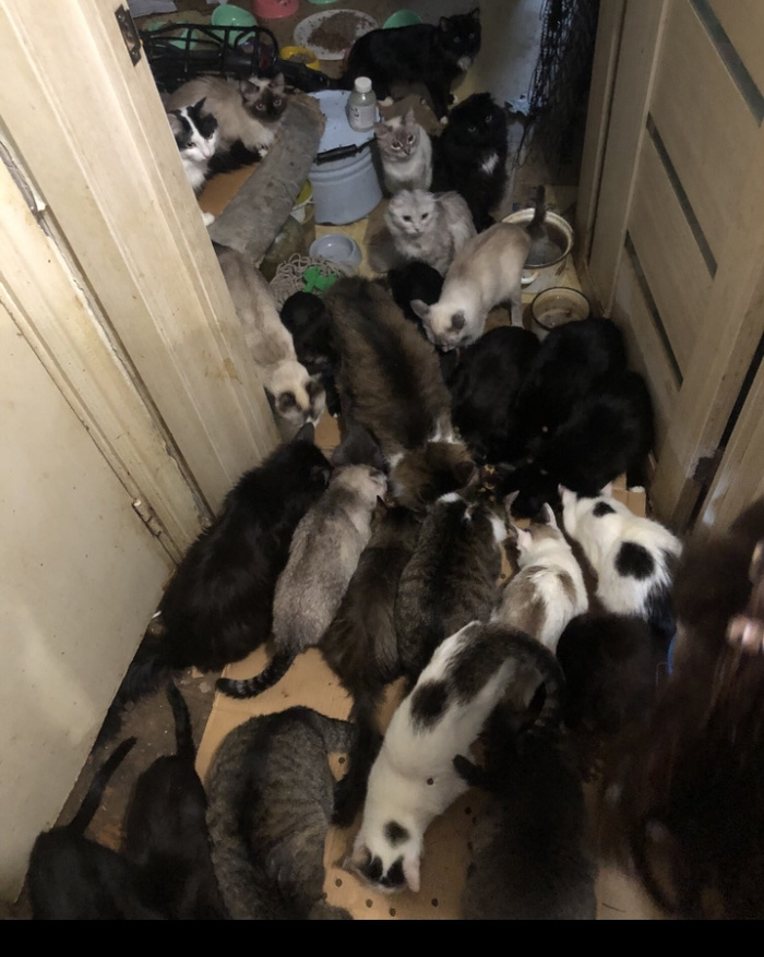 есть у нас в городе квартира в которой проживают очень много кошек(примерно 40+, точное количество неизвестно.)😢