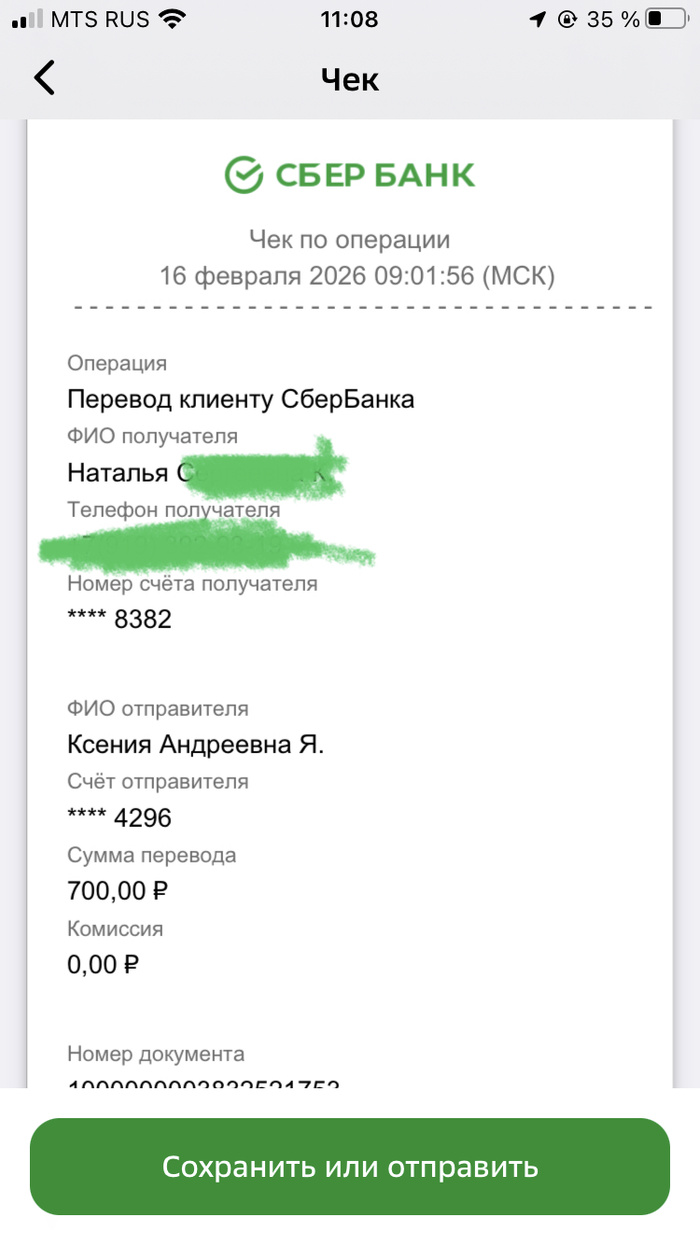 ✳по номеру телефона, привязанному к карте: 89120309059 — получатель Ксения Андреевна Я.