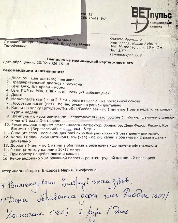 Температура норм, вес набрал,не худеет, все слипшиеся клочья сбрили, сдали ПЦР на опасные болезни. Выявили глаукому, повышенное давление глаз.