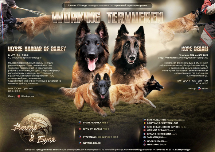 ❤ Ulysse Vhagar of Baxley (импорт Швейцария) - BH-VT, T-1, ОКД-2, с 2 месяцев в тренинге мондио - молодой перспективный кобель, несущий ринговые крови. Единственный в России тервюрен, привезенный из европейского рабочего питомника, который специализируется на тервюренах и малинуа, выступающих в в различных спортивных нормативах - IGP, французский ринг, мондьоринг. Собаки питомника of Baxley успешно работают на поиске людей под лавинами.