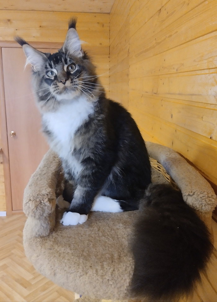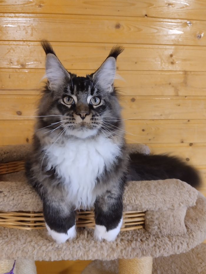 Питомник кошек породы мейн кун "ANiTaCoon" г Н.Тагил предлагает к продаже котика черного тикированного окраса с белым. Д.р. 01.02.2025 Котенок полностью привит, проглистогонен и обучен всем "кошачьим премудростям". Помощь в доставке во все города!