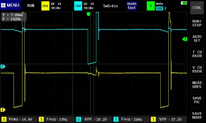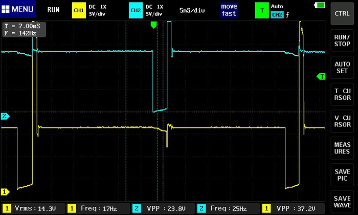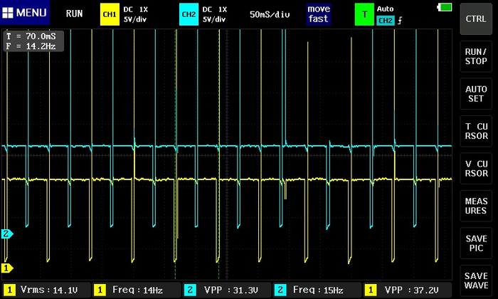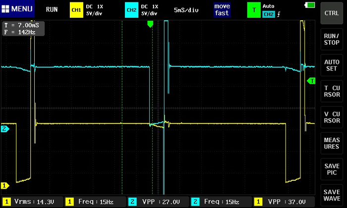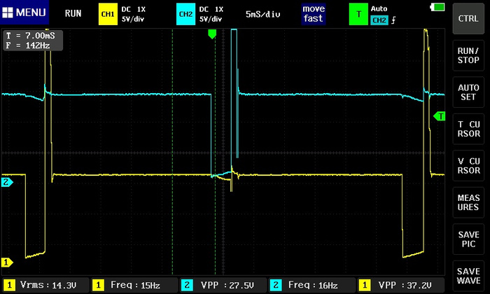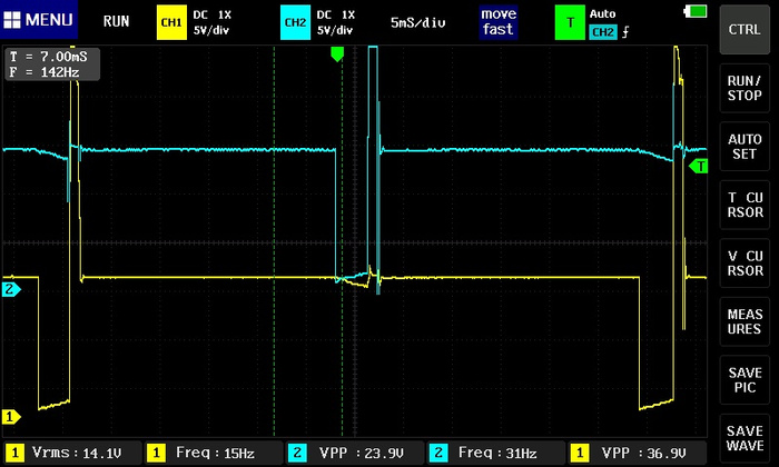 сигнал инвертировать надо, чтоб смотреть привычней, дальше - над масштаб другой, дальше - сетка то где ? ты ж по сетке то померять можешь и время накопления и время горения и тп , смотри "вблизи", так ведь нихрена не понятно, по катушке - есть первичка, а есть вторичка ..