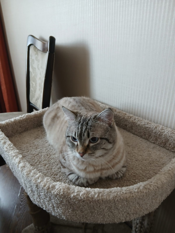 Кот, около 1года, маленький снежный барс с голубыми глазами, крупный, на высоких лапках, явно бывший домашний, самостоятельный, был найдет на улице возле входа в подвал, первых хозяев не нашли.