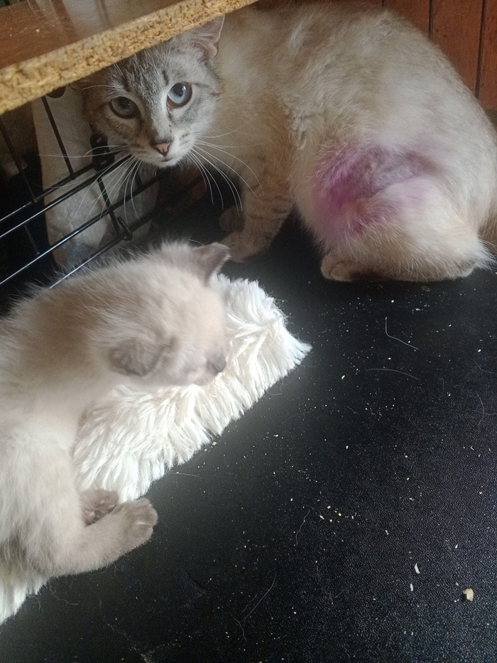 Эта совсем, шипит и кидается. Есть ее сестра, точь-в-точь, она трусиха, но могу взять в руки и гладить. Она сейчас докармливать котенка и тоже в пристрой.