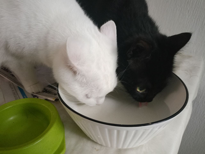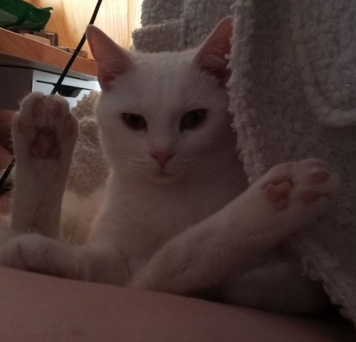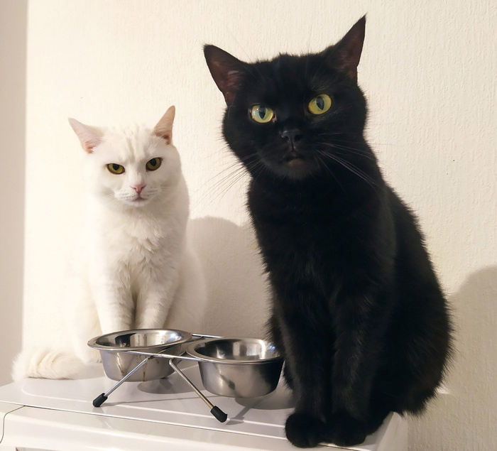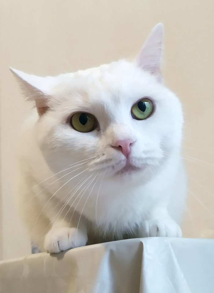 Белая - чуть более застенчивая, ласковая, спокойная. Два года. Стерилизована.