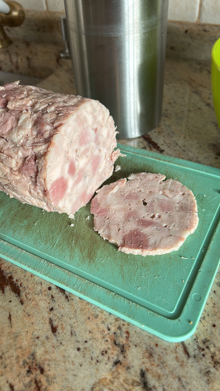набить плотно в ветчиницу и на водяную баню на +- 2часа при 80-85гр.