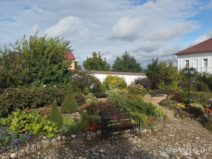 Монахини ухаживают за территорией, много цветов.