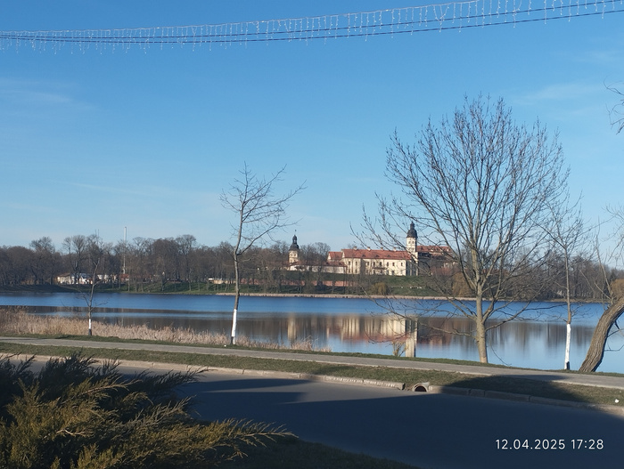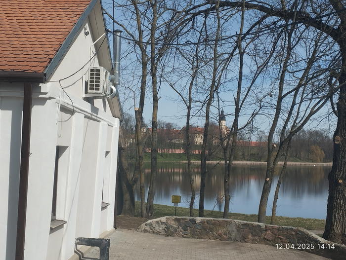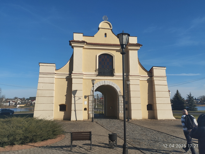 Замок находится на острове .К нему идет дамба , раньше был деревянный мост , что бы в случае тревоги, быстро разобрать его или просто сжечь