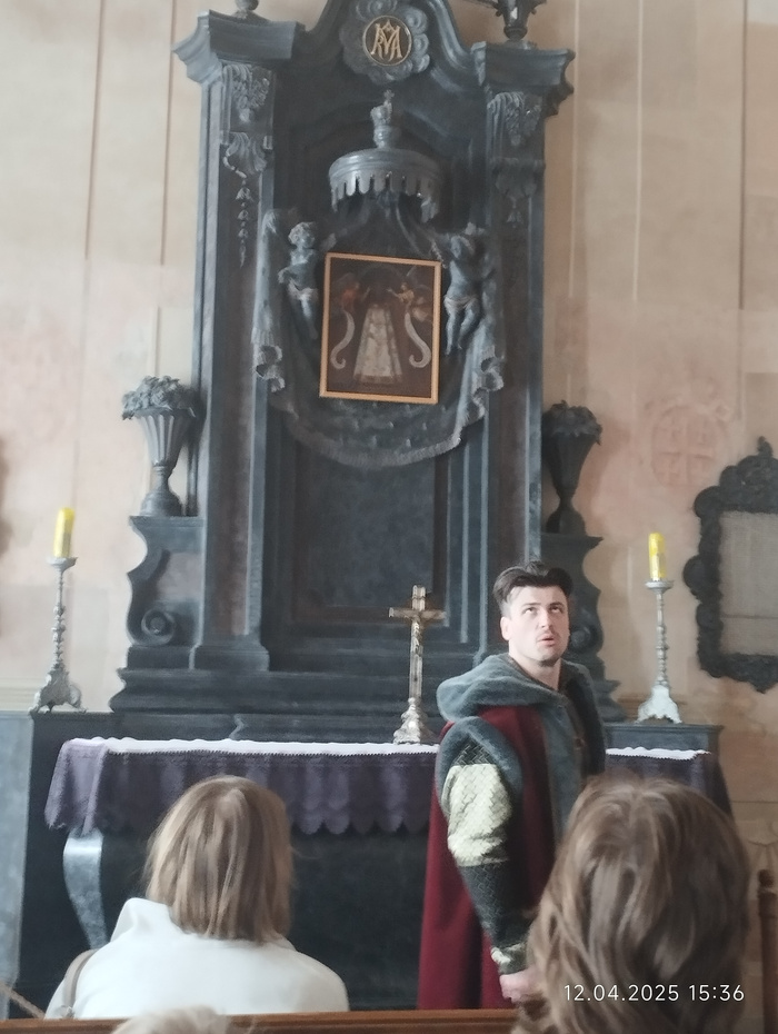 Актер разговаривает с духом, в замковой церкви .Аккустика отличная.