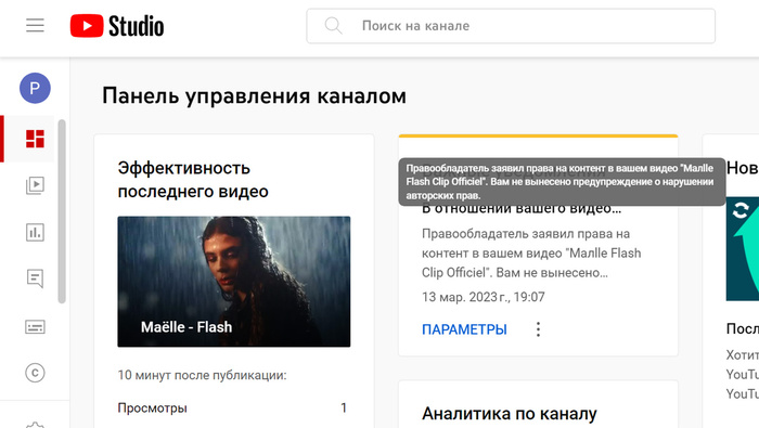 Загрузил на один из своих каналов. Content ID обнаружила контент, защищённый авторским правом, и предупредила, что видео будет доступно не во всех странах. Это не страшно, сейчас для меня главное, чтобы было доступно в лучшей в мире стране. Так делать можно, это не криминал. Если криминал, то видео удаляется и каналу выписывается предупреждение ("кидается страйк"). Три таких страйка в течение там какого-то не помню времени - и канал проследует в Вальхаллу. Мне как-то на основной канал кидали страйк из-за авторских прав, причём где-то через года два с тех пор как клип стал доступен на YouTube. Какой-то чушман там проснулся и
