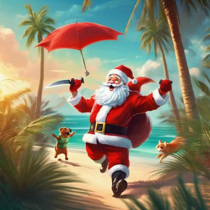 На запрос Красная Шапочка убегает от кровожадного Деда мороза, который хочет её расчленить, изнасиловать и съесть, с ножом, на фоне моря и пальм, ИИ добавил кошечку и собачку.